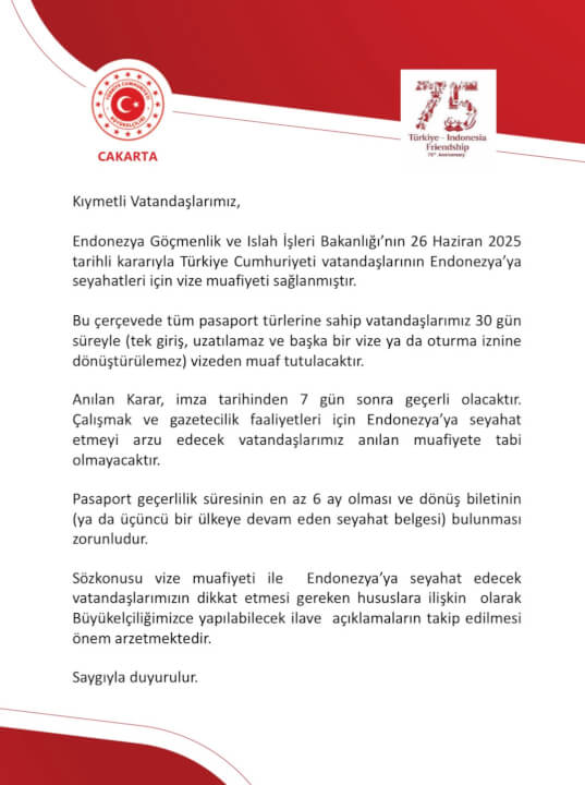 T.C. Cakarta Büyükelçiliği de Türk vatandaşlarına yönelik vize muafiyeti kararını resmi olarak doğruladı. T.C. Cakarta Büyükelçiliği konuyla ilgili sosyal medyadan yaptığı açıklamada, “Çalışmak ve gazetecilik faaliyetleri için Endonezya’ya seyahat etmeyi arzu edecek vatandaşlarımız anılan muafiyete tabii olmayacaktır. Pasaport geçerlilik süresinin en az 6 ay olması ve dönüş biletinin bulunması zorunludur” denildi.