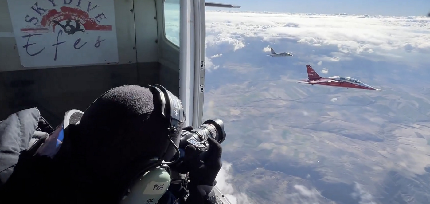 Paylaşılan kayıtlarda, 12 bin feet yükselikteki medya ekibinin bir uçağın açık kapısından, dondurucu rüzgarlara ve yüksek irtifadaki zorlu fiziksel koşullara aldırış etmeden nasıl çalıştığı görülüyor.